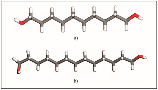 Conformers in long-chain 1,ω-alkanediols series: (a) TTt-TTt and (b) TTt-TGt.
