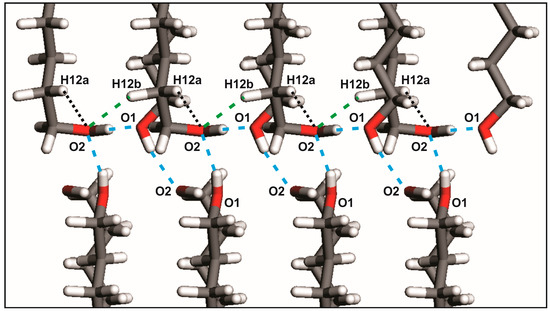 Each hydrogen bond in both patterns links two molecules symmetrically related by a screw axis 21. On the other hand, weak hydrogen bonds C-H···O in odd-numbered members UNDOL and TRDOL are encountered between the C2-H bond of the -TGt isomer of a molecule and the hydroxyl Oxygen -O1- of the same -TGt segment of the contiguous molecule along direction c (Figure 4). This behavior suggests that this weak interaction aims to stabilize both the gauche defect and, subsequently, the OH···O intermolecular pattern. Namely, it should be responsible for redirecting the OH···O into the intralayer interaction, leaving only one interlayer hydrogen bond. From an intramolecular point of view, the -TGt isomer is also stabilized by a C-H···O interaction between hydroxyl oxygen -O1- and a methylene hydrogen of the β-carbon (C2) in the alkyl chain (Figure 4). The corresponding van der Waals distances are 2.60 and 2.61 Å, for UNDOL and TRDOL, respectively, which are very close to the sum of van der Waals radii of oxygen and hydrogen atoms [24]. So far, the oxygen atom in the -TGt molecular ending shows a multifunctional crystal packing behavior (Figure 3): it simultaneously acts as donor and acceptor in both hydrogen bonds O-H···O, as well as being involved in the stabilization of the gauche defect via the intralayer hydrogen bond interaction C-H···O, and the intramolecular interaction O···H (Cβ). The chain parity effect influences molecular conformation by the stabilization of conformer TTt-TGt in odd-numbered members; that is to say, the combination of isomers with more stability [24] and the trans-gauche-trans sequence is the more effective way to maintain the chain pattern of O-H···O. The structures with even-numbered alkyl chains guaranties the stabilization of a chain pattern of hydrogen bonds by an all-trans conformer or TTt-TTt, i.e., trans-trans sequence, without C-H···O hydrogen bonds or determinant conformer-stabilizing van der Waals interactions.
