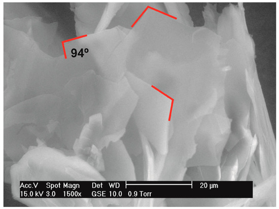 The planes (-104) and (208) showed preferred orientation in the DEDOL sample. The latter is one plane among those of the family {104}, which connects methylene groups of adjacent molecules in the molecular layer. Both planes showed a value of r-March parameter <1, indicating a double platelet-like orientation of the crystallites of the sample. The acute angle between both planes is 86.04°, showing a relatively significant difference with respect to the value of the monoclinic angle β of the unit cell expressed after a conventional setting: 83.30°. About this comparison, it is important to note that the transformation of unit cell to a setting of parameters expressed in a conventional protocol is carried out since the original parameters are obtained from the whole pattern fitting process using a reduced cell with the obtuse angle β closest to 90° (Table 3). The platelet-like nature of the orientation model characterized by two preferred planes lead us to speculate about the occurrence of a likely columnar habit of the crystallites, where the angle between both planes would determine the shape of a third surface. On the assumption of equivalence between the angle between oriented planes (-104) ^ (208) and β of the unit-cell, the scanning electron microscopy (SEM) image in Figure 5 corroborates this assumption. A scheme of the combined form {-104}/{104} and pinacoid {010} encountered in DEDOL from the March-Dollase approach is illustrated in Figure 6. The DODOL presented preferred orientations over the planes (104) and (1 0 10). The overlapping of peaks in the 1,ω-alkanediols GIXD patterns was evident, and the selection of the preferred oriented planes in DODOL was not straightforward because of the close presence of the Bragg reflections in crystallographic planes (104) and (-104) with a slight difference of 0.008° in 2θ. Therefore, the correct selection of the strongest preferred oriented plane was done with the help of the isomorphic crystal structure of DEDOL wherein the most intense reflection plane is undoubtedly for the (-104) plane. In fact, the refinement of the March parameter for (-104) in the DODOL pattern improves the fit. The plane (1 0 10) passes through the molecular center and grouped the binary axis of the C2 molecules. Both oriented planes in DODOL showed an r-March parameter that also indicates a platelet-like behavior (Table 3). The angle (-104) ^ (1 0 10) results in a value of 77.54°, very close to the value of β of the conventional unit-cell, that is 78.45°. Thus, in this case, it seems reasonably to explain the rhomboid surfaces of the crystallites on the basis of the value of β. Textured fractions for reflections (-104) and (1 0 10) are 55% and 44%, respectively, indicating a similar preponderance of both platelet-like orientation models.