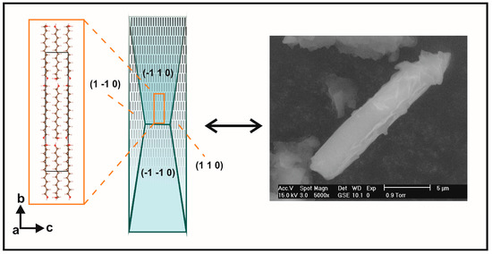 Comparison between deduced crystal morphology {110}/{101} and scanning electron microscopy ( SEM) microphotograph of TRDOL. Arrangement of molecules is illustrated by black bars inside the wireframe of crystal form. Crystal forms and structure with unit-cell are not at same scale.