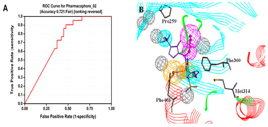 Generation of CBP model for HPPD inhibitors (A) ROC curve of CBP-Hypo2; (B) Complex based pharmacophore (CBP) model with co-crystallized ligand, magenta, orange and cyan represents HBD, RA and HY respectively.