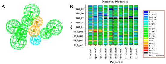 Generation of the HipHop pharmacophore. (A) The HipHop-Hypo2 chemical features. The color of the pharmacophore features, namely, HBA, RA and HY, re green, orange and cyan, respectively; (B) The heat map of the ten hypotheses from the test.