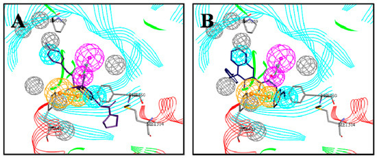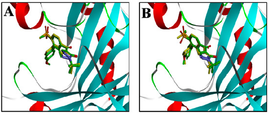 Alignment of the docked ligands with the ligands in the crystallographic complex. (A) The ligand by the LibDock docking method; (B) the ligand by the CDOCKER docking method. Docked ligands are green, the ligand in the crystallographic complex is yellow.