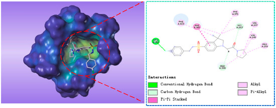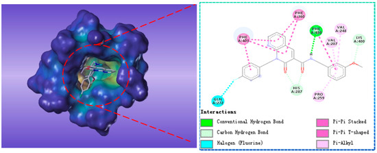 Compound G622-0791 was found to fully embed into the active pocket (Figure 7), and interacted with amino acids Gln272, Phe398 and Lys400 via H-bonds, meanwhile, the two benzene rings formed two pairs of sandwiches interacting with Phe360 and Phe403 at the binding site.