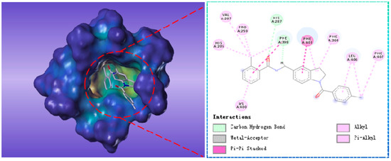 Compound G883-0470 formed π-π stacking interactions with Phe398, Phe403 and Phe406 and generated hydrogen bond interactions with His287 and Phe398 as depicted in Figure 8. Compound G883-0326 formed π-π stacking with benzyl ring of Phe398, Phe403 and Phe360. His287 interacted with carbonyl via hydrogen bond was shown in Figure 9.