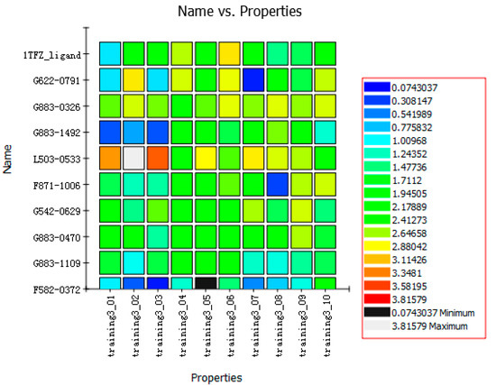 Heat map of the ten hypotheses from docked compounds and ligand of HPPD.