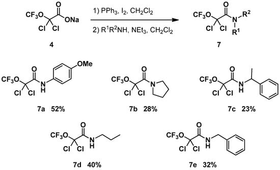 Most fluorinated carbenes are known for their electrophilic character. They usually react with electron rich functionalities [33,34,35]. The presence of an oxygen atom adjacent to the carbenic center in the carbenic species 6 (Scheme 2) we planned to generate, was however susceptible to alter this normal behavior [36,37,38]. We thus attempted the trapping of the derived carbene 6 with a wide panel of variously substituted olefins with either electrophilic (trichlorofluoroethene, dimethylbutadiene, etc.) or nucleophilic (enol ethers, etc.) character. Whatever the conditions employed (solvents, temperature, aromatic, double or triple bonds as a trap), no trace of the desired chlorotrifluoromethoxymethylated compounds was obtained. In some cases, the only perfluorinated molecule detected was the dichlorotrifluoromethoxymethane 5 [39]. Even if very volatile, we were able to isolate it by careful distillation (from a crude mixture with diglyme as solvent), yielding small amounts of pure product 5. The latter was characterized by NMR. The generation of the expected carbene 6 was assumed to proceed in a two-step pathway: first a decarboxylation followed by the elimination of a chlorine atom. The presence of the compound 5 was a formal proof of the success of the first step but also of the inability of the carbanionic intermediate to evolve into a carbenic species. Its final reprotonation (from a proton coming from the reaction medium) delivered then the neutral molecule 5. In order to assess the shelf stability and utility of salt 4, we tried to use it in the preparation of some amide derivatives 7, using an already described method for chlorodifluoroacetic acid (Scheme 3) [40].