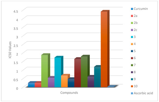 From the obtained results (Table 1), we conclude the following structure–activity relationships (SARs): (1) Heterocyclic derivatives of curcumin are less active than curcumin using low concentrations. (2) The different aryl substituents of compounds 2a–c affect the IC50 values, the best derivative which contains a non-substituted benzene ring. (3) By comparing the structures of Compounds 3–5 with the obtained results, it was found that the most potent was Compound 5, which had the lowest electronegative atom. (4) The ring size in the case of Compounds 6 and 7 has no effect on the values of the antioxidant power. (5) Compounds 8–10 (R = H, Ph, Et) exhibited variable IC50 values, of which the unsubstituted one is preferred. (6) Using higher concentrations of the tested sample increases the antioxidant power of the tested compounds (higher than 40 µg/mL).