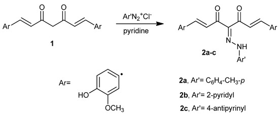 General procedure: Preparation of the diazonium salt: 0.2 g of sodium nitrite was dissolved in 2 mL of water in an ice bath and added drop by drop to a solution of various aromatic amines, such as p-toluidine (0.01 mol), 2-aminopyridine (0.01 mol), and 4-aminoantipyrine (0.01 mol) in conc. HCl (3.0 mL). The formed diazonium salt solution was added drop by drop with stirring to curcumin (1) dissolved in pyridine (20 mL) in an ice bath. The reaction mixture was stirred for an additional two hours at 0–5 °C and left overnight in the refrigerator at 0 °C. The precipitated solid was filtered off, washed with water, dried, and recrystallized from ethanol to yield curcumin derivatives 2a–c, respectively.