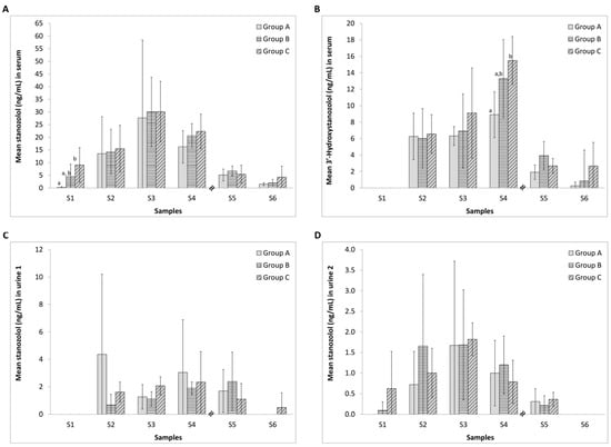 Concentrations of stanozolol and 3′-hydroxystanozolol in serum ((A,B) respectively) and stanozolol in urine samples ((C) pre-treatment (urine 1) and (D) one hour post-treatment (urine 2)) from group A (5 mg/kg stanozolol only), group B (5 mg/kg stanozolol + 1 mg/kg diclofenac) and group C (5 mg/kg stanozolol + 5 mg/kg diclofenac). Error bars represent standard deviations. Different letters (A,B) denote statistically significant differences between the treatment groups (p < 0.05) at a sampling point. Effect sizes are given in Table S1. Test sensitivity over time differences, are displayed in Table S2.