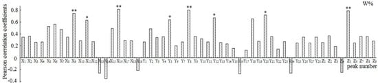 Each of the peaks was respectively analyzed with the W and S, and the relationships between the peak area and the pharmacological results were reflected by Pearson’s correlation coefficient (Figure 4 and Figure 5). The results demonstrated that the peaks X9, X11, X16, Y5, Y8, Y12, Y20, and Z5 to W and the peaks X12, X16, X18, Y14, Z5, and Z8 to S showed statistical significance (p < 0.05).