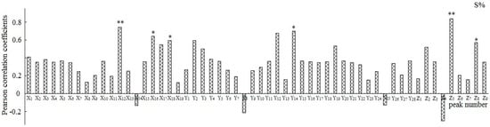 The union of the ENTER and STEPWISE results in the regression were the peaks of X5, X11, X12, X16, X18, Y5, Y12, Z4, Z5, and Z6. The results in the correlation analysis were the peaks X9, X11, X12, X16, X18, Y5, Y8, Y12, Y14, Y20, Z5, and Z8. The union of the regression and the correlation analysis results were the peaks of X5, X9, X11, X12, X16, X18, Y5, Y8, Y12, Y14, Y20, Z4, Z5, Z6, and Z8. The intersection of the regression and the correlation analysis results were the peaks of X11, X12, X16, X18, Y5, Y12, and Z5.