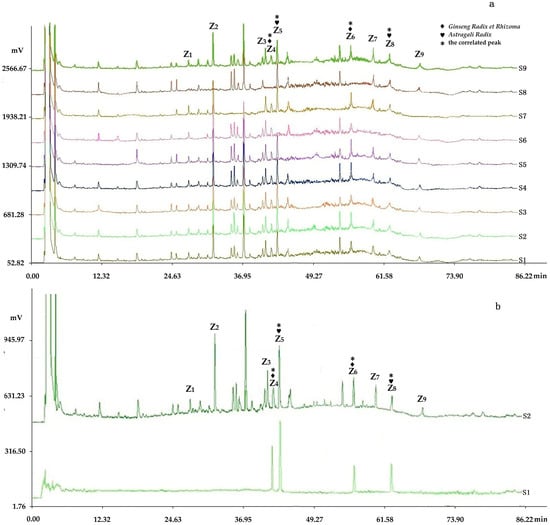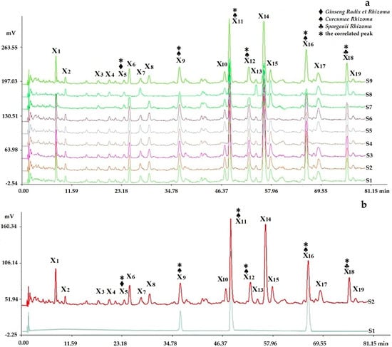 Chromatogram comparing the fingerprints analyzed by chromatographic condition I (HPLC-PDA) with negative control samples and reference standard samples: (a) S1–S8 were respectively the negative sample without Hirudo, without Epimedii Folium, without Cervi Cornu Pantotrichum, without Fritillariae Thunbergii Bulbus, without Ginseng Radix et Rhizoma, without Astragali Radix, without Sparganii Rhizoma, and without Curcumae Rhizoma, in which peak 5 was from Ginseng Radix et Rhizoma; peaks 9, 11, 12, and 16 were from Curcumae Rhizoma; peak 18 was from Sparganii Rhizoma by comparing with the negative control solutions (S1–S8); (b) S2 and S1 were respectively the fingerprints of the sample solution and reference standard solution, in which three peaks were respectively identified by comparing with the reference standard substance: peak 9, germacrone; peak 11(S), furandiene (reference peak); peak 16, β-elemene.