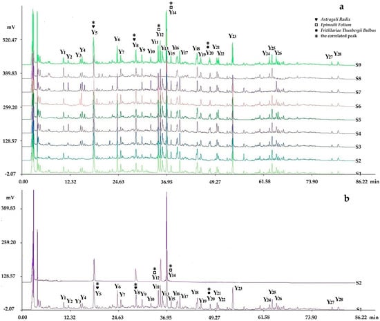 Chromatogram comparing the fingerprints analyzed by chromatographic condition II (HPLC-PDA) with negative control samples and reference standard samples: (a) S1–S8 were respectively the negative sample without Cervi Cornu Pantotrichum, without Fritillariae Thunbergii Bulbus, without Hirudo, without Ginseng Radix et Rhizoma, without Curcumae Rhizoma, without Sparganii Rhizoma, without Astragali Radix, and without Epimedii Folium, in which peaks 5 and 8 were from Astragali Radix; peaks 12 and 14 were from Epimedii Folium; and peak 20 was from Fritillariae Thunbergii Bulbus by comparing with the negative control solutions (S1–S8); (b) S2 and S1 were respectively the fingerprints of the reference standard solution and sample solution, in which peaks 8, 12, and 14(S) were identified as ononin, epimedin B, and icariin (reference peak) by comparing with the reference standard substance.