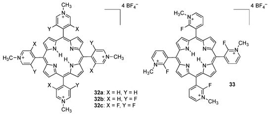 Fluorinated derivatives of m- or p-linked meso-pyridyl porphyrins were prepared along Adler synthesis routes [75]. N-Alkylation of the pyridyl substituents by treatment with (CH3)3O+BF4− afforded the tetra-alkylated products 32 and 33, respectively, as their tetrafluoroborate salts (Figure 2).