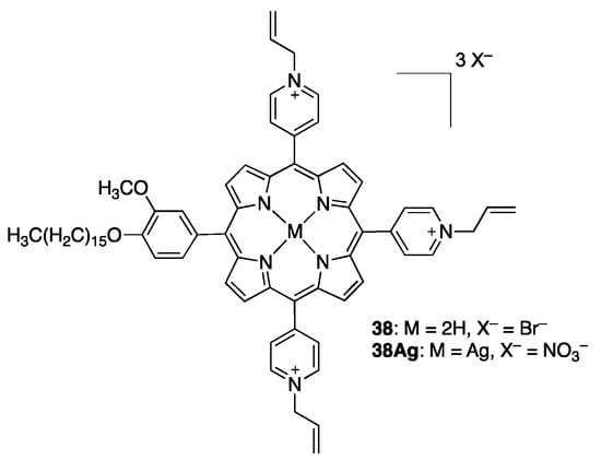 Gasparyan and co-workers synthesized an A3B amphiphilic trispyridylporphyrin with one meso-aryl group carrying a long alkyl chain using a mixed aldehyde Adler condensation [88]. Quarternization of the pyridyl groups with 3-bromopropene provided the water-soluble vinyl-substituted trispyridiniumporphyrins 38 and 38Ag (Figure 3) that were isolated by precipitation with acetone.