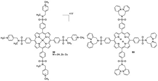 Porphyrins bearing alkylated pyridinium substituents in positions not directly linked to the meso- or β-positions of the macrocycle were also prepared. For example, Marzilli and co-workers synthesized porphyrins 52 (Figure 4) with the pyridyl groups linked through sulfonamide linkages to the p-phenyl positions of meso-tetraarylporphyrins [59,95]. They investigated whether distant pyridinium groups are equally competent in mediating DNA-intercalation. Dipicolylamine (DPA) substituents could also be linked through the sulfonamide group (53), to prepare rhenium-based radiopharmaceuticals [96].