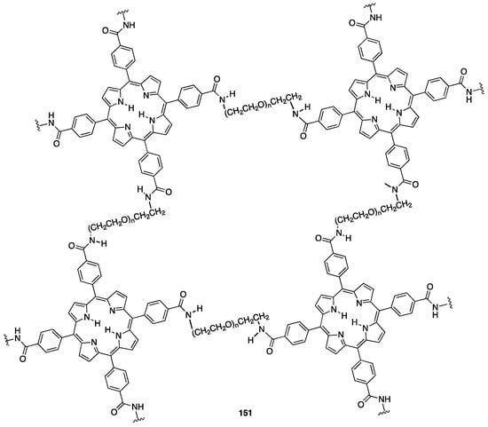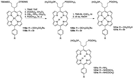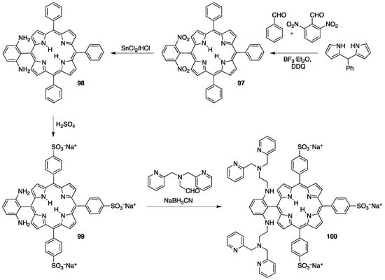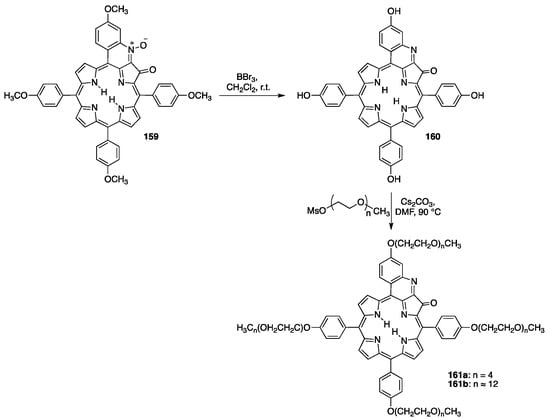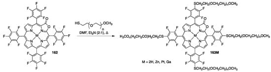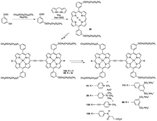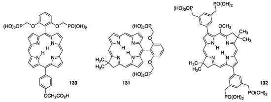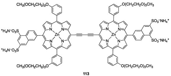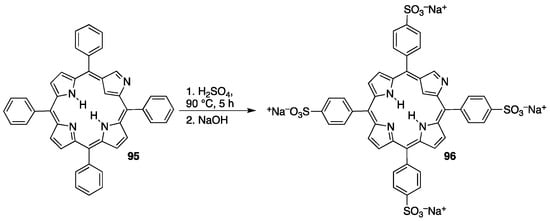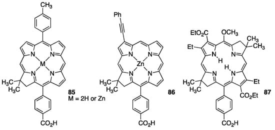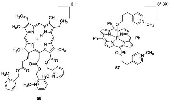 Pyridinium substituents have also been introduced in the axial positions of phosphorus and antimony meso-tetraphenyl porphyrins by axial exchange using a pyridine-derivatized alcohol (cf. to Scheme 11) [89,98]. Alkylation of the axial pyridyl moiety with a range of alkyl bromides furnished derivatives such as 57 (Figure 5), with a water-solubility of ~3 mM [89].