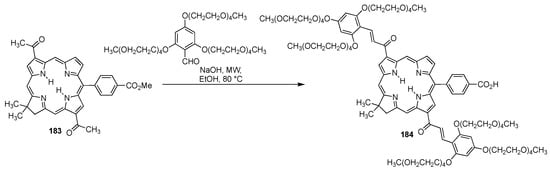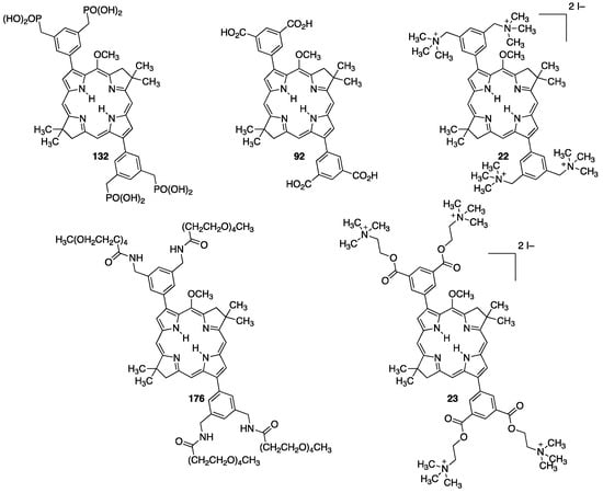 Other ammonium-based water-soluble derivatives were also prepared by the Lindsey group by introduction of spiro-linked piperidine moieties at the β-positions of a bacteriochlorin [69]. The integral spiropiperidine functional groups were quarternized using standard conditions to furnish water-soluble derivatives, such as bacteriochlorin 25 (Figure 1).