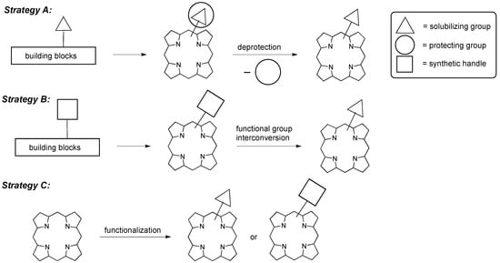 The review is organized along the charge the solubilization groups introduce: Cationic (amine/ammonium, pyridyl/pyridinium), anionic (sulfonate, phosphonate, carboxylic acid/carboxylate) and neutral (polyethylene glycol (PEG) chains). Each section discusses the examples loosely in increasing order of complexity and the position of the solubilizing group. Three principle strategies for the introduction of solubilizing groups can be distinguished (Scheme 1). Strategy A encompasses the synthesis of a porphyrin macrocycle using building blocks bearing solubilizing groups (protected or not). Strategy B involves the synthesis of a porphyrin macrocycle with precursor functionalities, that can later be manipulated to hydrophilic groups. Strategy C employs synthetic modifications of an already-formed porphyrin to impart water solubility.