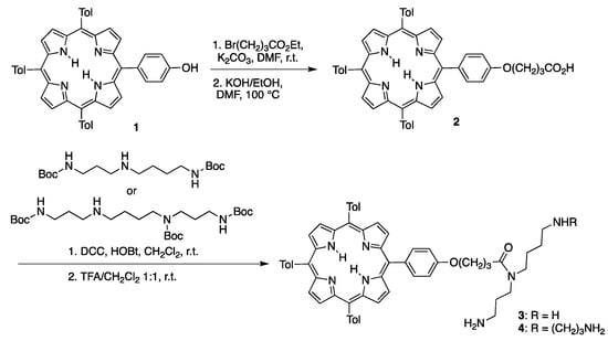 Krausz and co-workers, for example, synthesized polyamine-meso-arylporphyrin conjugates by DCC-mediated amide-coupling of carboxylic acid-functionalized A3B porphyrin 2, made by functionalization of phenol 1 with di-Boc-protected-spermidine or tri-Boc-protected-spermine (Scheme 2) [60]. The ultimate starting A3B porphyrin 1 was synthesized using a mixed aldehyde Adler condensation, followed by alkylation of the phenolic oxygen with ethyl 4-bromobutanoate and saponification. The thus generated polyamines were submitted to standard Boc-deprotection conditions to afford the polyamine-porphyrin conjugates 3 and 4, respectively.