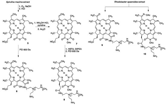 Chlorin and bacteriochlorin polyamines derived from Spirulina maxima and Rhodobacter spaeroides, respectively, as described by the group of Sol [61]. PEI = polyethyleneimine (PEI, MW 600 Da), HBTU = (2-(1H-benzotriazol-1-yl)-1,1,3,3-tetramethyluronium hexafluorophosphate), DIPEA = N,N-diisopropylethylamine.