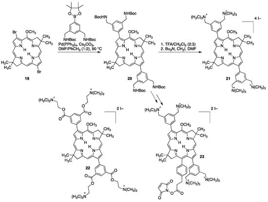Lindsey and co-workers also used similar dibromobacteriochlorin 19 to directly introduce arylamines to the β-positions via Suzuki couplings (Scheme 6) [65]. After the coupling of dibromo-bacteriochlorin 19 with an aryl boronic ester bearing two Boc-protected amines, the Boc groups in product 20 were removed, and the free amine quarternized by treatment with CH3I to afford the final ammonium-functionalized bacteriochlorin product 21.