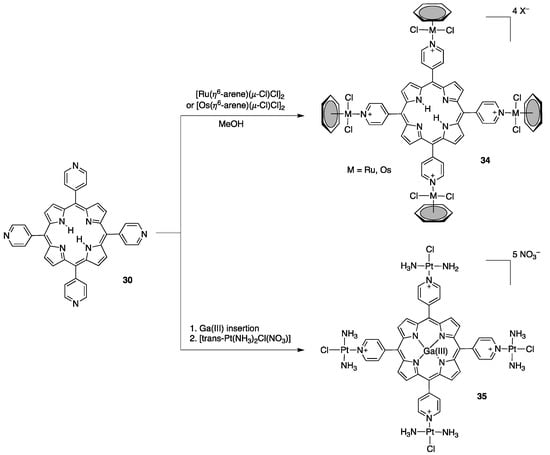 In search of dual-action photo- and cytotoxic anti-cancer agents, various metal complexes were coordinated to the outer pyridyl nitrogens in tetrapyridylporphyrins (Scheme 9). Ruthenium, rhodium and iridium complexes were thus prepared by Therrien and co-workers [76] by treatment of meso-tetrapyridylporphyrin 30 with various metal arene salts to afford the water-soluble organic metallic complexes of type 34. They also prepared mixed arene-ruthenium substituted porphyrins in a similar manner, producing mono- and tetrametallated derivatives of 3- and 4-tetrapyridyl-porphyrins [77]. Both cis- and trans-platin conjugates of porphyrins were prepared by treatment of 30 with cis- or trans-Pt(II) complexes, respectively [77]. The gallium complexes of these compounds (such as 35) were prepared by Odani and co-workers [78] and also tested as photosensitizers for cancer therapy. In addition, tetrapyridylporphyrins with ruthenium nitrosyl groups substituted at their periphery were reported by the group of Alessio, generated by reaction of 30 with ruthenium nitrosyls and purified by column chromatography (CHCl3/5% EtOH as eluent) [79].