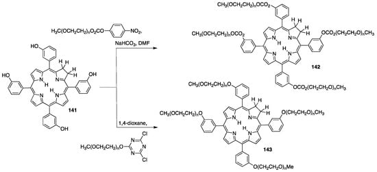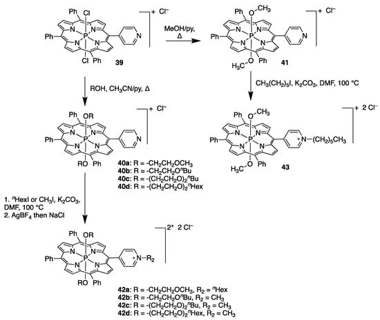 Yasuda and co-workers prepared AB3 phosphorus porphyrin 39 [89]. Its axial chloro-ligands could be exchanged for simple alcohols and oligoethylene glycol chains to generate hydrophilic phosphorus porphyrins 40 and 41. N-Alkylation of the meso-pyridyl group in 40a–40d or 41 then furnished water-soluble derivatives, with solubility in water of around ~10 mM for compounds 42a–42d and 43. (Scheme 11) [89]. An equivalent methodology was used to introduce axial PEG chains [90].