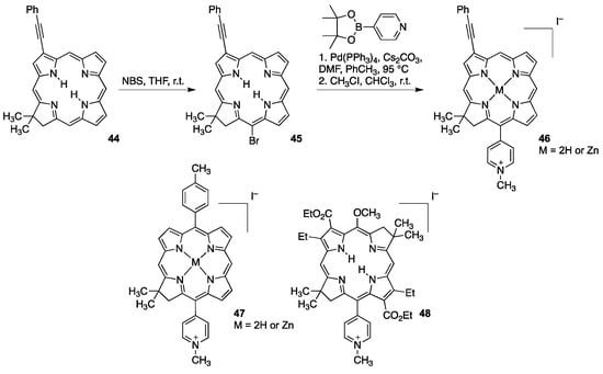 Using a fundamentally different strategy toward meso-pyridyl porphyrins, pyridyl substituents can be introduced to meso-brominated porphyrins by using Suzuki couplings. For instance, the group of Lindsey reported the synthesis of a series of amphiphilic hydroporphyrins prepared by Suzuki coupling of a pyridyl boronic ester with meso-bromo-chlorins or bacteriochlorins [34]. Key chlorin building block 45 was prepared by regioselective meso-bromination of chlorin 44 using NBS (Scheme 12) [91]. In the final step of the synthesis, the pyridyl functional group was quarternized with CH3I to furnish bacteriochlorin 46. This strategy is flexible and tolerant of a number of other substituents on the hydroporphyrin framework. Thus, chlorin 47 and bacteriochlorin 48 were prepared along analogous routes.