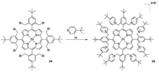 A remarkable octapyridiniumporphyrin 55 was prepared by Prato and co-workers [97] by treatment of meso-tetrakis(2,6-bis-(bromomethyl)-4-t-butylphenyl) porphyrin 54 with t-butylpyridine (Scheme 14). The octapyridyl porphyrin 55 was purified by crystallization from Et2O/MeOH. The octacationic compound 55 was used in studies toward assemblies for light-harvesting applications.