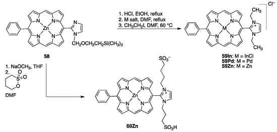 The synthesis of porphyrins carrying N-alkylated meso-imidazolyl functionalities represents another strategy for the preparation of cationic porphyrins [99]. Lindsey and co-workers prepared porphyrins with one or two meso-imidazolyl groups by starting from imidazole-functionalized dipyrromethane precursors [100,101]. Mono-imidazolyl porphyrin 58 was alkylated with various alkylating reagents. The resulting imidazolium porphyrins were studied for their use in photodynamic therapy. The zwitterionic imidazolium sulfonate porphyrin 60Zn, for example, is the product obtained when 1,4-butane sultone was used as the alkylating reagent (Scheme 15) [100].
