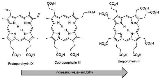 Many naturally occurring porphyrins contain acetic acid or propionic acid side chains [102]. With increasing number of acid side chains, their solubility in aqueous solution increases, with the uroporphyrins being freely soluble, particularly in solutions of basic pH (Scheme 16) [102].
