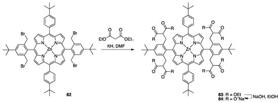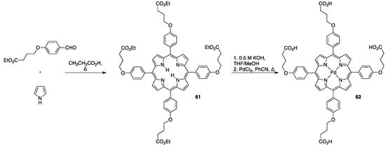 meso-Tetrakis(4-carboxyphenyl)porphyrin, and its ester, are well known, and readily synthe-sized by condensation of the corresponding aldehydes with pyrrole [103,104,105]. They are also commercially available [58]. Carboxylate groups may also be introduced to the porphyrin by starting with more elaborate building blocks containing esters. Classic carboxylated meso-aryl porphyrins, such as meso-tetrakis(4-carboxyphenyl)porphyrin, have been prepared by Adler synthesis with ester-substituted benzaldehydes followed by saponification of the esters [40]. Tetracarboxylated palladium porphyrin 62 was prepared thusly, whereby the carboxylate moieties were revealed by standard ester saponification conditions after the palladium insertion step (Scheme 17) [106].