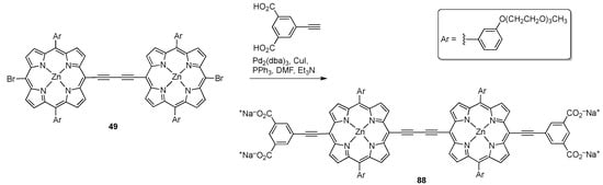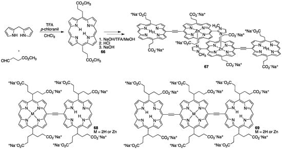 Water-soluble acetylene-linked bis(imidazolylporphyrins) were prepared from starting materials bearing protected acid functionalities. Thus, ester-functionalized aldehyde and dipyrromethane were condensed and oxidized to synthesize porphyrin 66 bearing ester-terminated alkyl chains in the meso-positions. The ester moieties were carried through the entire synthesis of the porphyrin dimer and the carboxylates were only deprotected in the last step (Scheme 19) [108]. Using this strategy, bulky bis(carboxylethyl)methyl substituents could also be introduced to the meso-positions early in the synthesis to furnish dimers of type 68 and trimers of type 69, which showed less aggregation in water [109].