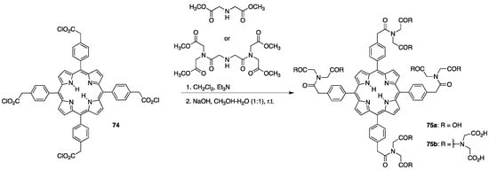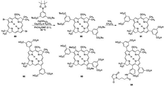 Lindsey and co-workers prepared carboxylated trans-AB porphyrins using a 2 + 2 dipyrromethane condensation strategy, using dipyrromethane 70 carrying a protected 2,4,6-triester-subsituted meso-phenyl group (Scheme 20) [110]. The condensation of 70 and counterpart 71 in the presence of zinc afforded the zinc-porphyrin triester 72, which could be saponified to afford the tricarboxylic acid 73a. Along an analogous route, trans-AB porphyrins 73b and 73c bearing bioconjugatable groups at the meso-position opposite the solubilizing groups were prepared.