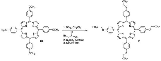 An introduction of esters to the β-positions of a porphyrin from ester-substituted building blocks is also possible, as illustrated by the synthesis of carboxylated benzoporphyrins starting from an ester-functionalized isoindole (Scheme 18) [107]. A retro-Diels-Alder reaction of 63 with concomitant saponification of the methyl esters afforded octacarboxylate 64. Protonation provided the octaacid 65 that also precipitated under these conditions. The water-solubility of the sodium salt 64 was determined to be 0.111 M [107].