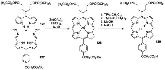 The N-alkylation step (standard CH3I alkylation conditions) needed to be performed after the formation of the isocyanate group to avoid unwanted N-alkylation of the amine precursors [81]. A number of p-substituted phenyl derivatives allowed a wide range of functionalizations. For instance, Song et al. synthesized A3B pyridyl porphyrin 37j with the fourth aryl group bearing a Pt(II) complex linked to the hydroxyl group of the meso-phenol group by a triethylene glycol linker [82]. N-Alkylation of the three pyridyl groups, followed by Boc-deprotection and complexation with the Pt(II) precursor, yielded the A3B platinum-porphyrin conjugate 37j. A similar approach was taken by the group of Alessio to synthesize water-soluble 99mTc(I)/Re(I)-porphyrin conjugates, such as 37l, utilizing an amide-linked spacer between the aryl group and the 99mTc(I)/Re(I) ion [83,84]. The water-soluble derivatives were purified by normal phase silica gel column chromatography (CH2Cl2/MeOH mixtures). These types of compounds can also be conjugated to cancer-targeting peptides for use in cancer therapy [85]. Cu(II)-based acylhydrazone porphyrin-derivatives 37m and 37n could be obtained using a similar strategy [86]. The group of Boyle synthesized an A3B porphyrin that could be further functionalized to establish an azide group [87]. The azide functionality was used in a click reaction to introduce an 18F-terminated short PEG chain to generate water-soluble porphyrin 37k for PDT/PET theranostic applications [87]. After N-methylation of the pyridyl nitrogens, the subsequent synthetic steps required precipitation of the product using Et2O/MeOH mixtures. The final products were purified by passing through a column of neutral alumina.