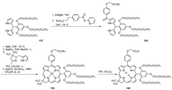 - Thamyongkit, P.; Lindsey, J.S. Synthesis of swallowtail-substituted multiporphyrin rods. J. Org. Chem. 2004, 69, 5796–5799. [Google Scholar] [CrossRef] [PubMed]