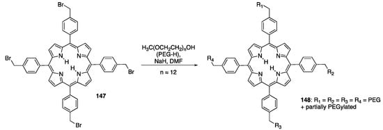 Orlandi and co-workers prepared meso-tetrakis(4-pyridinium)porphyrins (31) by reaction of meso-tetra(4-pyridyl)porphyrin (30) with various benzyl chlorides to study the effect of polar alkylating groups on their antibacterial activity [71]. The benzylation conditions required were more vigorous (reflux in DMF for 24 h) than typical for pyridine alkylations using alkyl halides. The water-soluble products were recovered by precipitation with Et2O and filtration. Similarly, Ghazaryan and co-workers prepared a variety of meso-substituted N-substituted tetrapyridiniumporphyrins with different central metals (Ag, Zn, Co and Fe) and alkylating agents (allyl-, oxyethyl-, butyl- and methallyl-substituted derivatives) [72]. A PEGylated derivative of meso-tetrakispyridiniumporphyrin was also prepared by alkylation of meso-tetra(4-pyridyl)-porphyrin with a short PEG-bromide [73,74].