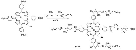 Amine groups were also introduced to porphyrins bearing carboxylic acid groups by esterification with an amino-alcohol. An example of this strategy was the preparation of a tricationic water-soluble ester of chlorin e6 11 (Scheme 4) [62]. Methyl pheophorbide a was saponified, and the acid groups in product 11 were activated as acid chlorides and esterified with N,N-dimethylamino-ethanol to provide triamine 12. Quarternization by reaction with CH3I gave the tricationic water-soluble chlorin derivative 13 [62].