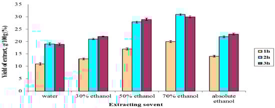 The method of extracting plant material under reflux was selected due to its routine application, requiring easily available apparatus and glassware, and high extractive yield. Different combinations of ethanol with water (30%, 50%, 70%, 100%) and pure water were evaluated in order to determine the corresponding extraction efficiencies and to identify the optimal solvent and time of extraction. Extraction was conducted for various extraction time durations using the optimal extraction conditions. The extract recovery yield appeared to increase as the extraction time increased up to 3 h, but further extension of the extraction time did not result in any further increase of extract recovery yield. No big difference in the extractive yield was observed between 2 h and 3 h and in the case of 70% ethanol 2 h extraction delivered more yield than 3 h. Therefore, in order to save energy and time, the optimal extraction time was set to be 2 h. All of the extracts obtained with 2 h extraction times were used for quantification of total polyphenols, flavonoids and their pharmacological activities. Figure 1 shows a graphical comparison of the extraction yields of various combinations of solvents and extraction time. Using 2 h extraction 70% ethanol delivered the highest extraction yield (31 g/100 g) among all the tested solvents, as the extraction values for H2O, 30%, 50%, and 100% ethanol were 19 g/100 g, 21 g/100 g, 28 g/100 g and 22 g/100 g, respectively.