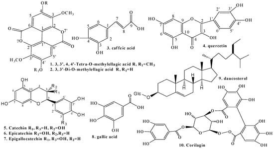 The structures of all isolated compounds were elucidated by analyzing their spectral data (MS, 1H- and 13C-NMR, including HMQC, HMBC and DEPT) and by comparison with published literature data. They were thus identified as 3,3′,4,4′-tetra-O-methylellagic acid [10], 3,3′-di-O-methylellagic acid [11], caffeic acid [12], quercetin [13], (+)-catechin [14], (–)-epicatechin [13], (–)-epigallocatechin [15], gallic acid [16], β-sitosterol-3-O-β-d-glucopyranoside [17] and corilagin [18] (Figure 2).