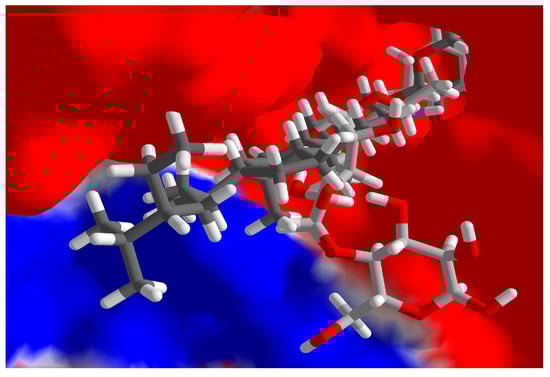Lowest-energy docked pose of daucosterol (dark grey stick figure) with human maltase-glucoamylase (PDB 3TOP), showing the electrostatic surface of the binding site. The co-crystallized ligand, α-acarbose, is shown as a light grey stick figure.