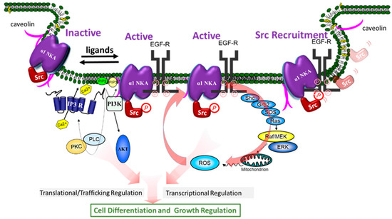 The first clue that Src kinase is important for NKA-mediated signal transduction was from the studies by Haas in early 2000 [56]. Src family kinases are membrane-associated non-receptor tyrosine kinases, and they play an essential role in the signal transduction pathways provoked by many extracellular stimuli such as growth factors, and ligands of G protein-coupled receptors [100]. We and others have shown that α1 NKA regulates Src activity through a conformation-dependent interaction. It also plays an important role in Src targeting through a phosphorylation-dependent mechanism. Binding of CTS to this NKA/Src receptor complex leads to the activation of the associated Src, recruitment of additional Src, and the initiation of the signal transduction processes (Figure 2) [101].