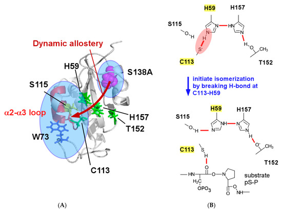 - Xu, N.; Tochio, N.; Wang, J.; Tamari, Y.; Uewaki, J.-I.; Utsunomiya-Tate, N.; Igarashi, K.; Shiraki, T.; Kobayashi, N.; Tate, S.-I. The C113D mutation in human Pin1 causes allosteric structural changes in the phosphate binding pocket of the PPIase domain through the tug of war in the dual-histidine motif. Biochemistry 2014, 53, 5568–5578. [Google Scholar] [CrossRef] [PubMed]