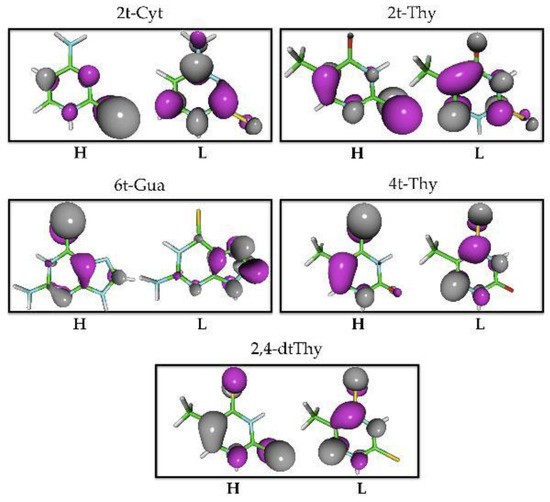 HOMO (H) and LUMO (L) molecular orbitals involved in the ππ* lowest spectroscopic state in 2t-Cyt, 2t-Thy, 6t-Gua, 4t-Thy and 2,4-dtThy.
