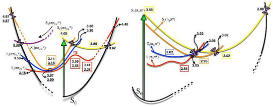 2t-Ura and 2t-Thy present a complex excited state PES whose main features are summarized in Figure 4. As a first approach to the problem, Gobbo et al. [91] and Cui et al. [90] locate, by means of CASSCF methods, two minima in the S2 and S1 potential preserving the ππ* and nπ* characters of the FC region (See Figure 4). At this point, it is important to highlight that all the works on 2t-Ura seem to provide a different FC state ordering [89,90,91]. According to Refs. [90] and [91], both minima are characterized by a significant elongation of the C2-S bond. However, whilst Ref. [91] predicts moderate out-of-plane distorted structures for both minima, caused by the pyramidalization of the C6 center, the Cs symmetry constraints imposed in the work of Cui prevent accessing the real minima [90]. A second additional minimum in the S2 potential, with πSπ2* character, but corresponding to the FC S4 electronic state, is latter identified by the group of González [89], using CASPT2 gradients. This minimum maintains the stretched C-S bond distance but shows a strong pyramidalization at the C2 position. Interestingly, González [89] (2t-Ura) and Barbatti (2t-Thy) [93] predict a very similar strongly C2 pyramidalized structure for the S1 nSπ2* minimum, in contrast with the quasi-planar structure calculated by Gobbo and Cui [90,91]. In the triplet manifold, altogether three triplet minima have been identified. Gobbo et al. and Cui et al. locate two minima with nSπ2* and πSπ456* characters in the T2 and T1 potentials (See Figure 4). Similar to what happened for the singlet manifold, CASPT2 predicts for the triplet nSπ2* minimum a very important out-of-plane deviation of the C-S bond relative to the pyrimidine ring. Two minima with πSπ2* and πSπ456* characters along the T1 potential, the first pyramidalized at the C2 position and the second showing a boat like conformation were also found [89,93]. The adiabatic relative energies of the most stable triplet states of 2t-Ura, which were calculated in the range 2.85–3.46 eV, compare very reasonably with the experimental 0-0 emission phosphorescence band from Ref. [94] at 3.17 eV. This is also the case of 2t-Thy where the computed energies for the two ππ* T1 minima amount to 3.20 and 3.23 eV [59], which compare reasonably well with the maxima of the experimental phosphorescence spectra at 2.73–2.76 eV [62,63].