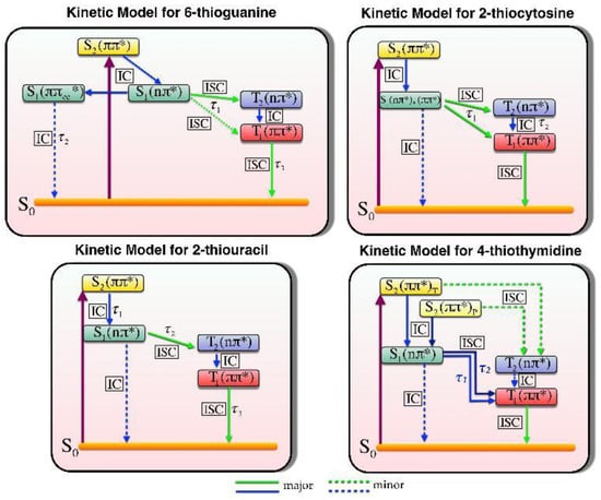 Proposed kinetic models for nucleobase thioderivatives inferred from the literature.