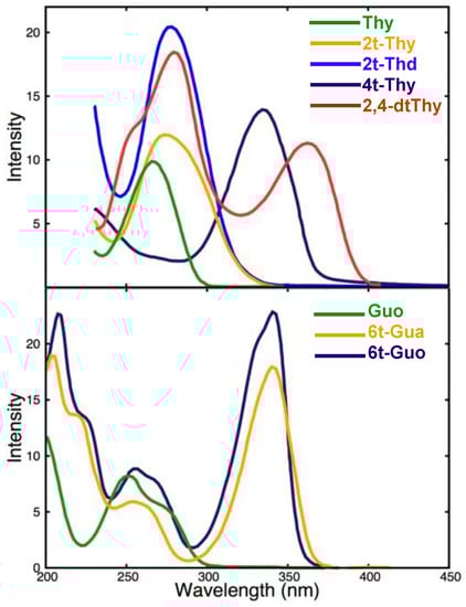 Aside from fundamental interest that would seek to understand how the nature of the substituents or their position along the purine and pyrimidine heterocycles [5,6] imprint the topography of the excited state potential energy surfaces (PESs) directing the photophysics of nucleobases, it has been recently recognized that specific thiated nucleobases could have been part of primordial RNA macromolecules [7,8]. Moreover, these systems are currently considered as very valuable prototypes for photosensitizers to be used in pharmacological applications, for their photosensitizing properties and structural similarity with canonical nucleobases, which facilitates their inclusion into parent DNA molecules.